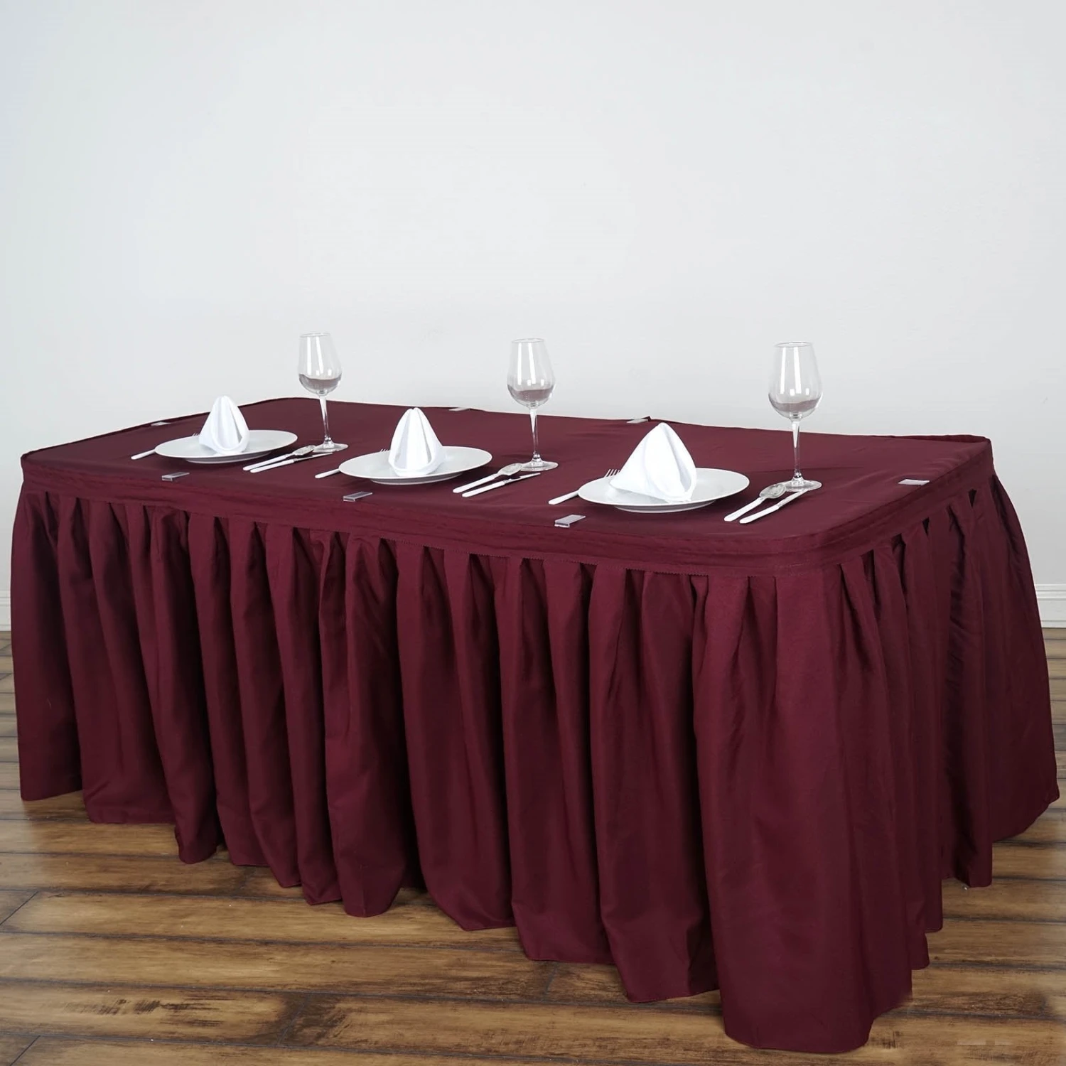 - 21ft Skirts: Covers 4 sides on a 8ft x 2 1/2ft banquet table – 20 clips minimum needed – 24 clips recommended.