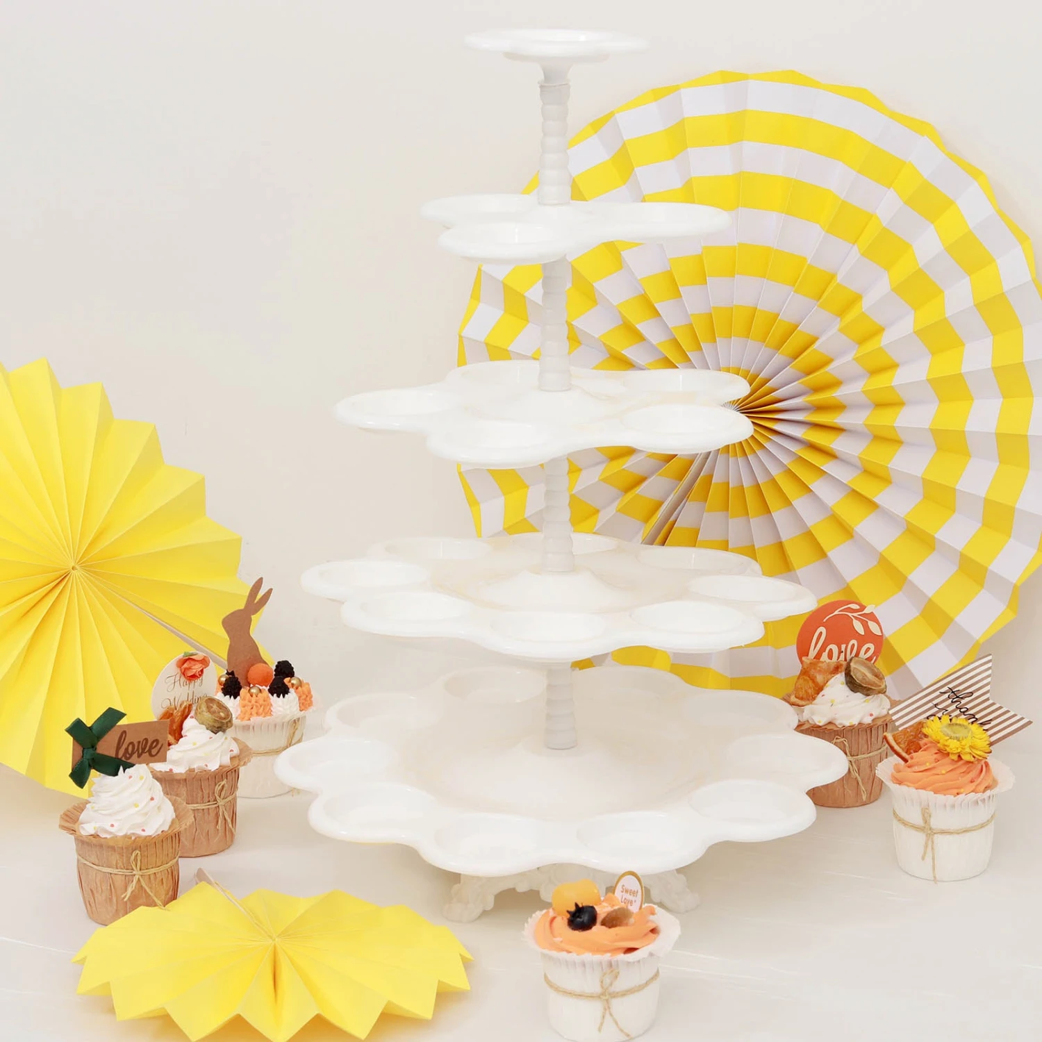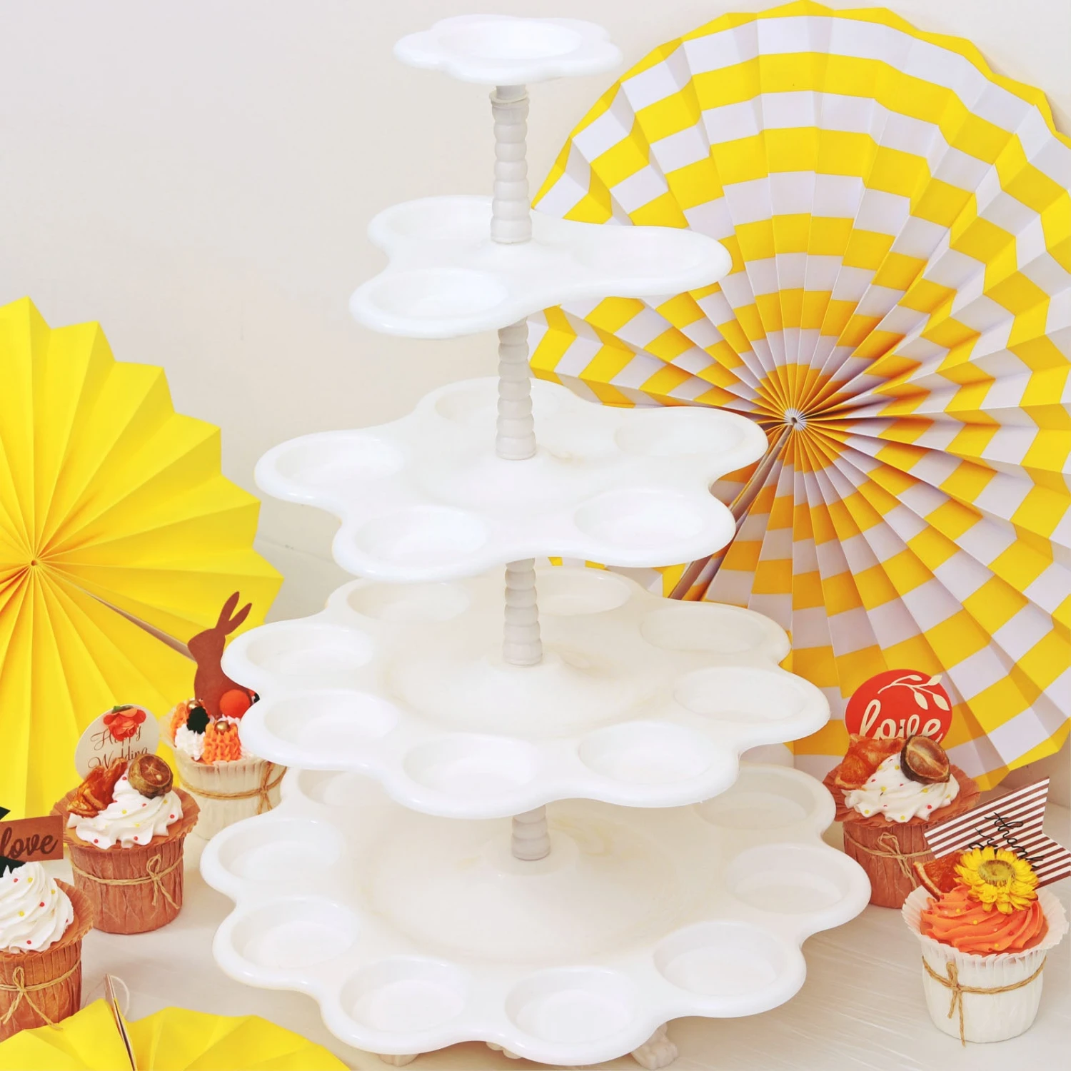 - Our 5 tier cake stand is firm, reliable, and stable. Each tier is made of high-quality plastic and the tiers are interconnected by sturdy posts with screws for strength and stability.