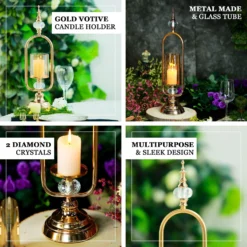 Gold Metal Pillar Candle Holder With Hurricane Glass Tube And 2 Crystal Globes 22″ Tall