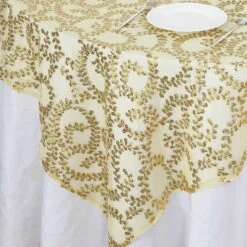 72″x72″ Sequin Leaf Embroidered Seamless Tulle Table Overlay, Square Sheer Table Topper
