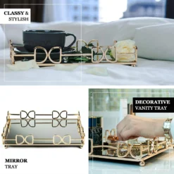 Set Of 2 | Gold Metal Decorative Vanity Serving Trays, Rose Bordered Rectangle Mirrored Trays – 19″x12″ | 15″x8″