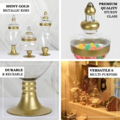 Set Of 3 Gold Trimmed Glass Apothecary Candy Jars With Lids -10″/14″/16″