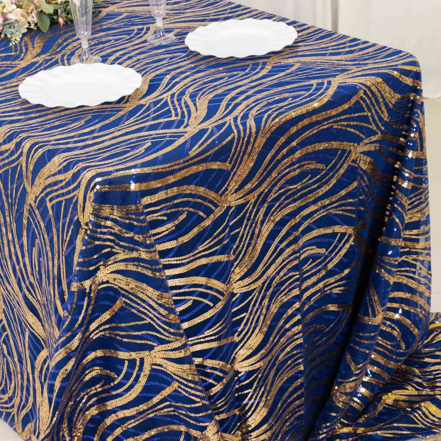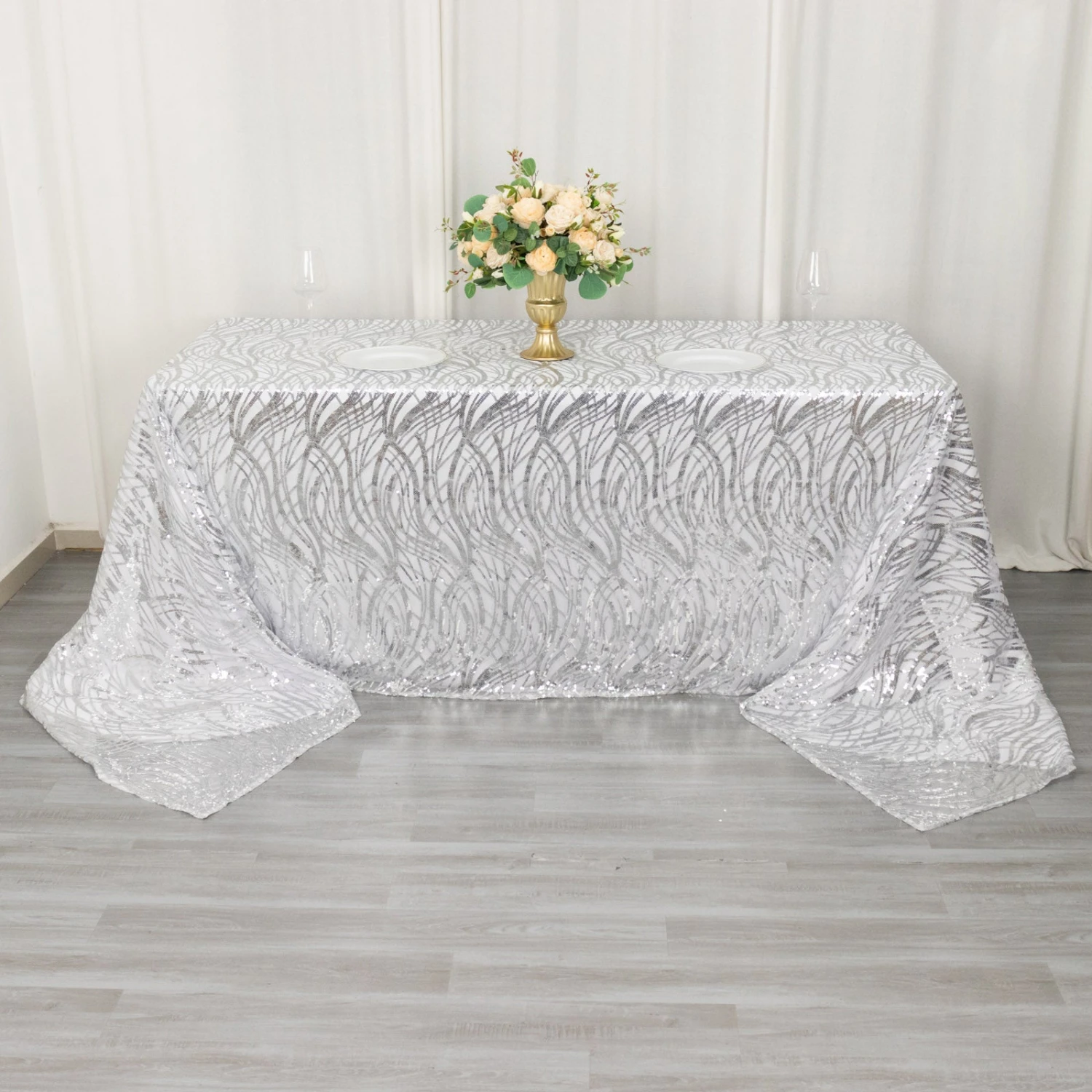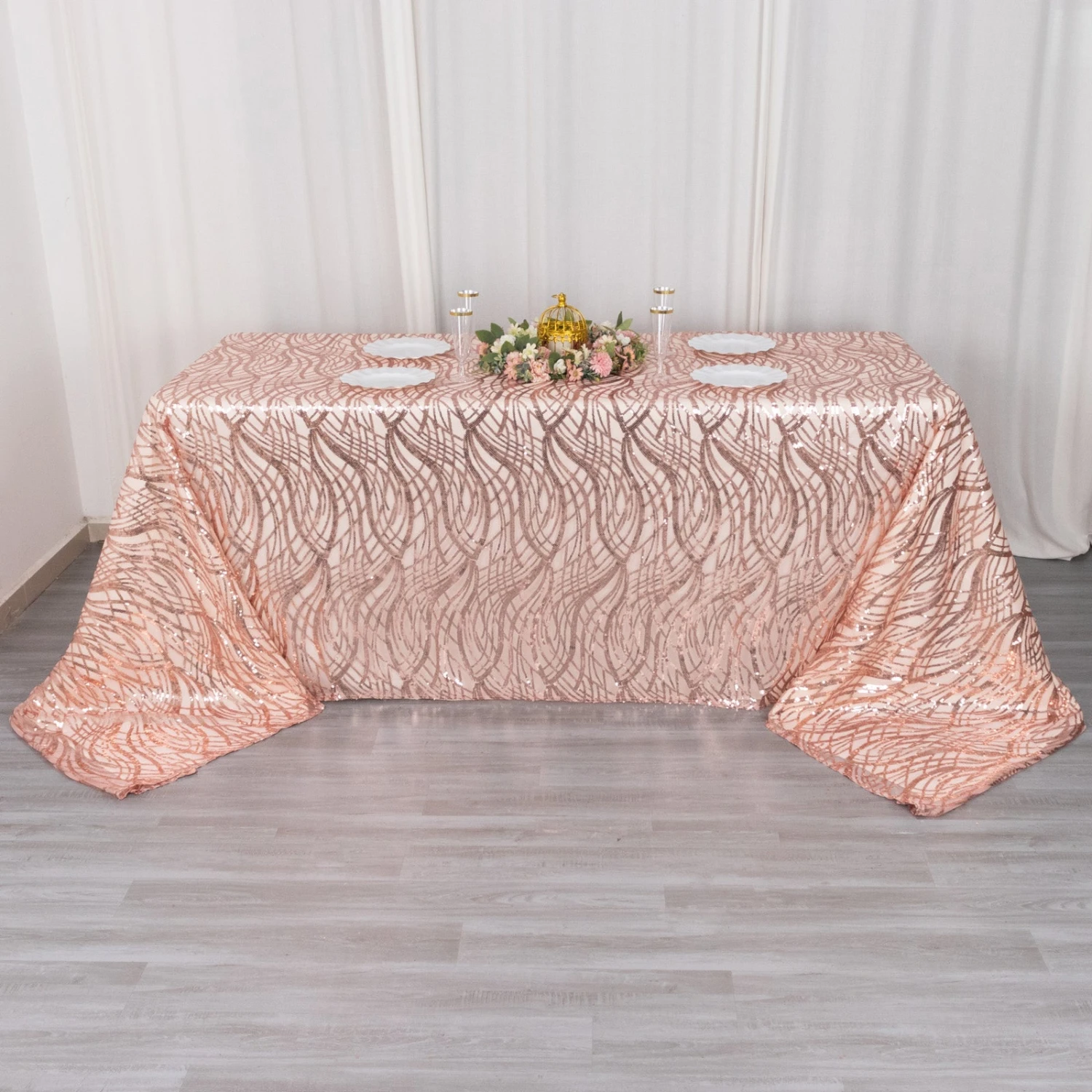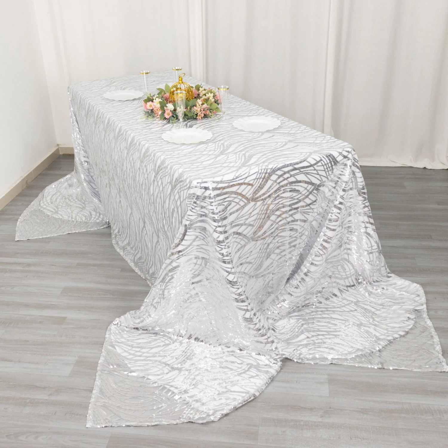 - Gives floor length hang on standard 8ft (96″x30″) rectangle table.